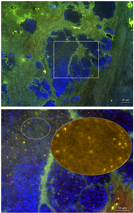Die Detailaufnahme (unten) zeigt in Vergrößerung des Ausschnitts Bakterien innerhalb der Biofilme, die auch mit der pan-bakteriellen FISH-Sonde EUB338 (orange) ein Signal zeigen (runder Ausschnitt). Die orange leuchtenden Bakterien enthalten zahlreiche Ribosomen, was eine (Rest-)Stoffwechsel-Aktivität der Bakterien anzeigt.