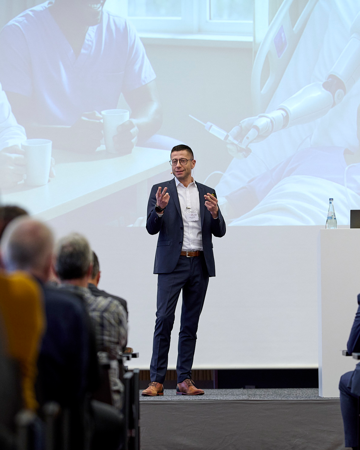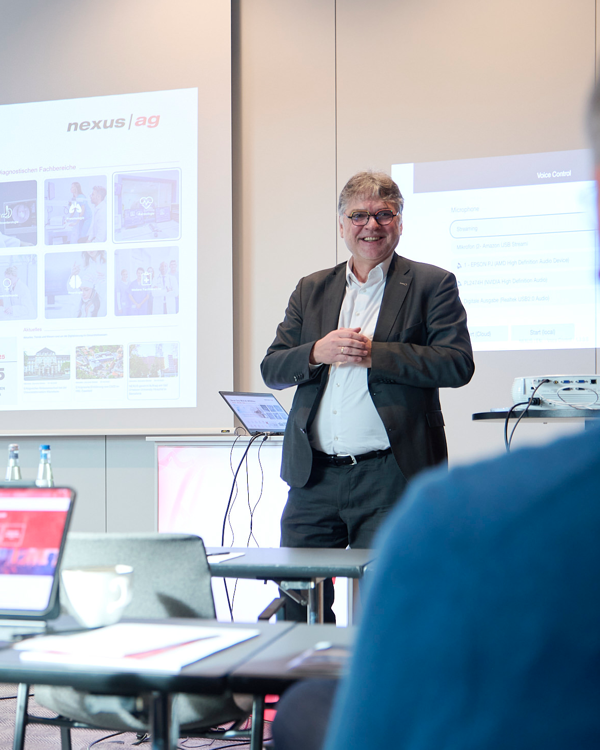Dr. Ingo Behrendt, Vorstandsvorsitzender der NEXUS AG, macht zu Beginn deutlich, worin die Stärke der Veranstaltung liegt. „Es ist keine Selbstverständlichkeit, Vertreterinnen und Vertreter so vieler Fachbereiche in einem Raum zu haben. Wir wollen, dass Radiologie, Labormedizin und IT miteinander ins Gespräch kommen.“ Digitalisierung im Gesundheitswesen funktioniere nicht in getrennten Silos. NEXUS verstehe sich als Partner, der Prozesse verbindet. „Wir entwickeln nicht mehr nur Produkte für einzelne Fachbereiche, sondern übergreifende Funktionalitäten, die in allen Systemen greifen“, sagt er.