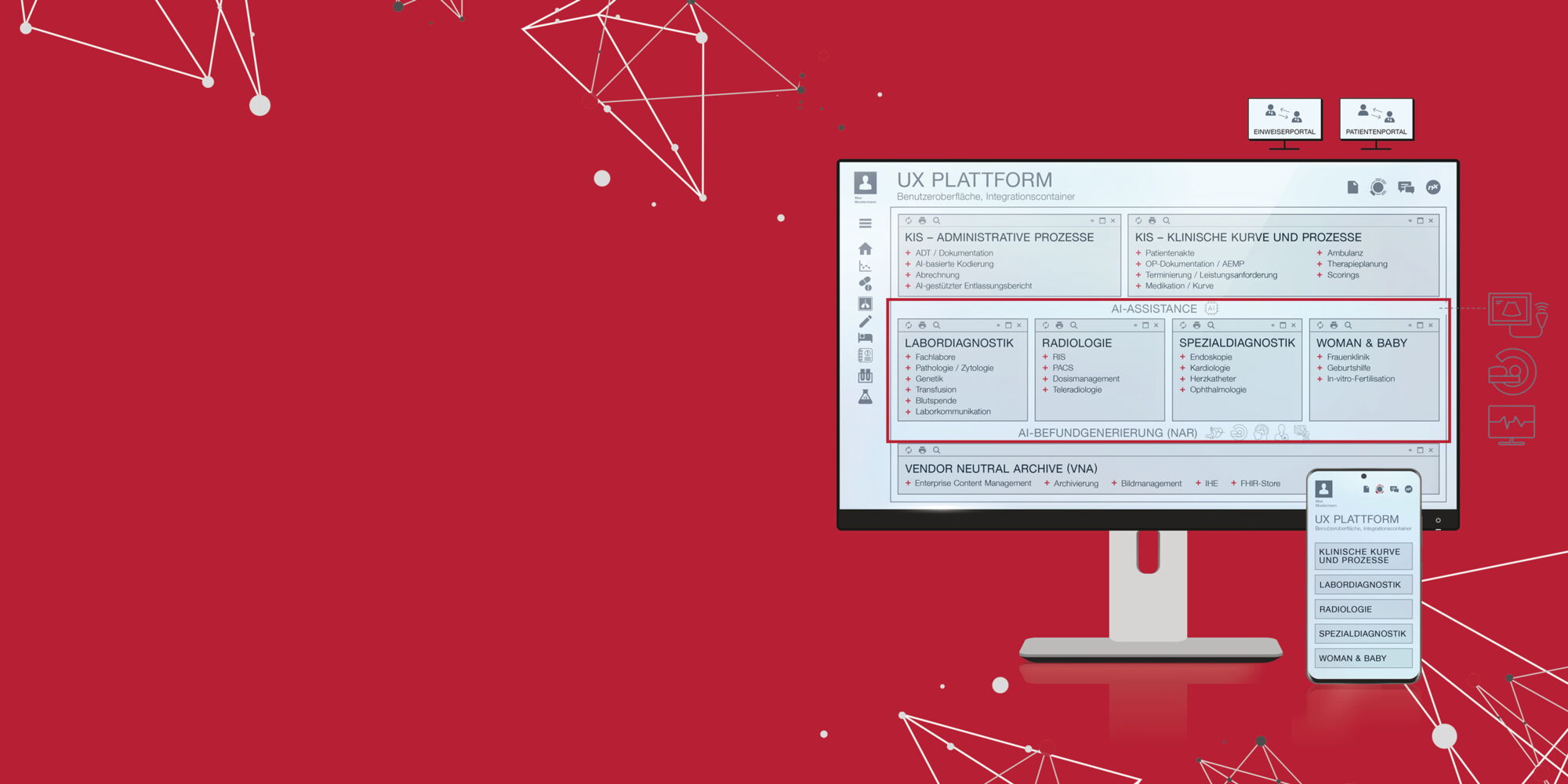 Die NEXUS KI-Plattform ermöglicht die Integration spezialisierter KI-Lösungen direkt in klinische Prozesse. Über eine offene Plattformstrategie können hochspezialisierte Anwendungen – etwa in Radiologie oder Pathologie – nahtlos in bestehende Systeme und Workflows eingebunden werden. So entsteht ein flexibles Ökosystem, das Innovationen schnell verfügbar macht und medizinische Fachbereiche gezielt mit KI-gestützten Funktionen erweitert.