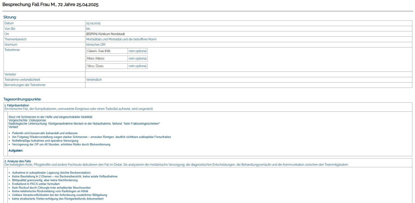 Das Team identifiziert mögliche Fehler, Kommunikationsprobleme sowie andere relevante Aspekte, die während der Fallbesprechung aufgefallen sind. Diese Erkenntnisse werden im System dokumentiert, um eine transparente Nachverfolgung und eine kontinuierliche Verbesserung der medizinischen Versorgung und Teamkommunikation zu gewährleisten.
