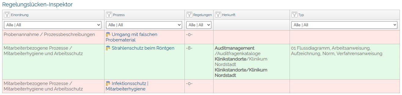Der Regelungslücken-Inspektor im NEXUS / CURATOR zeigt auf einen Blick, welche Prozesse ausreichend geregelt sind und wo noch Handlungsbedarf besteht. Für jeden Prozess werden Einordnung, vorhandene Regelungsdokumente, Dokumentenherkunft und Typ dargestellt. So dient die Ansicht als zentrales Steuerungsinstrument für kontinuierliche Verbesserung und rechtssichere interne Abläufe.
