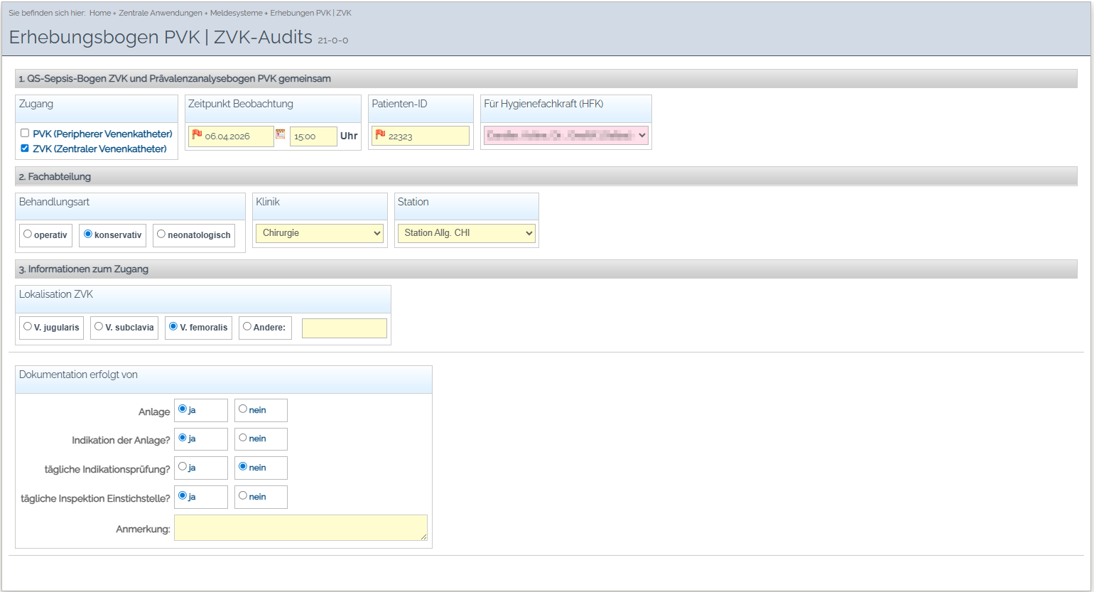 Digitale Erhebungsbögen im NEXUS / CURATOR unterstützen die strukturierte Prüfung hygienischer Standards – von der Katheterdokumentation über die tägliche Indikationsprüfung bis hin zu Verbandzustand und Fixierung.